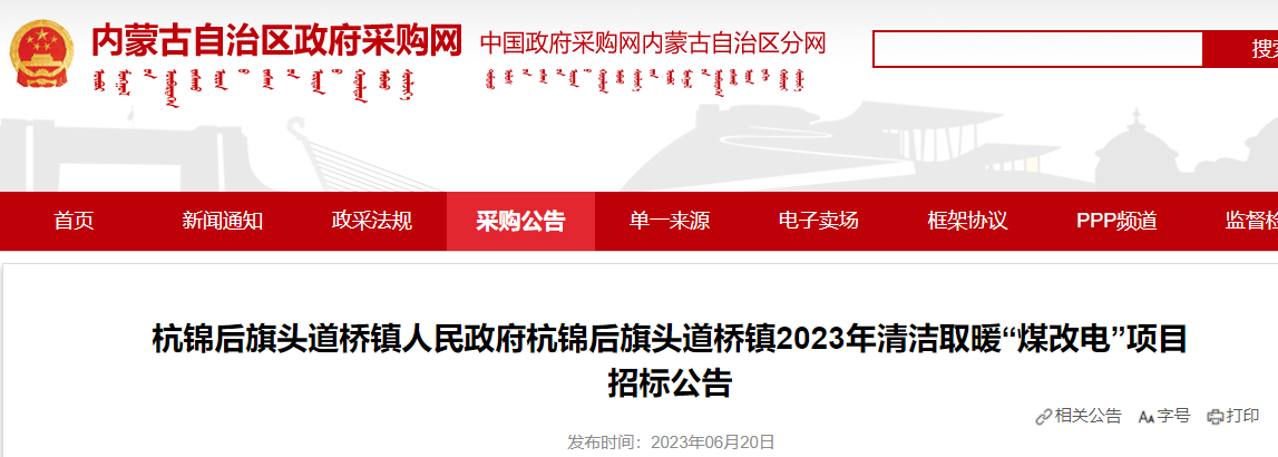 ◆杭錦后旗頭道橋鎮(zhèn)人民政府杭錦后旗頭道橋鎮(zhèn)2023年清潔取暖“煤改電”項(xiàng)目1007套招標(biāo)公告