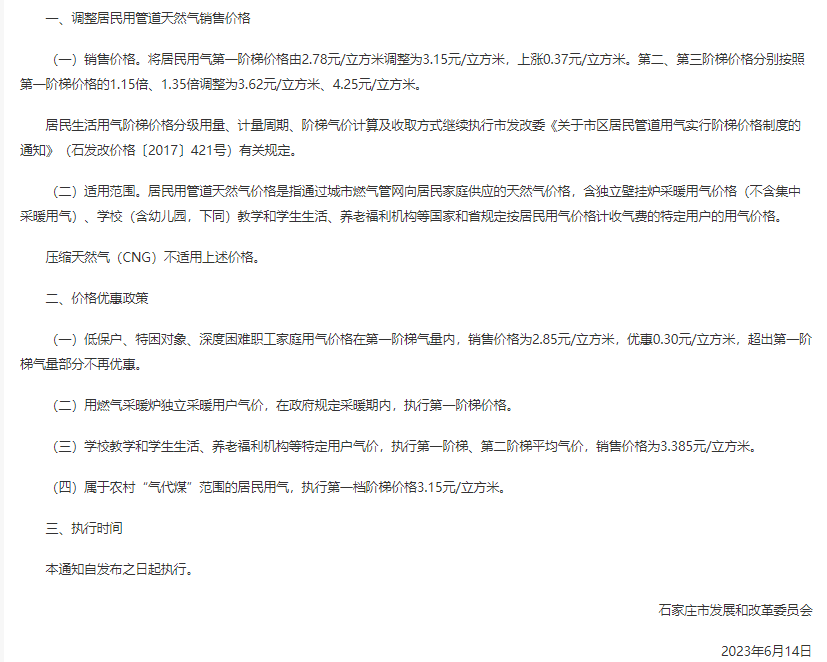 近日,河北省政府辦公廳發布《關于印發河北省2023-2024年采暖季天然氣保供工作方案的通知》(冀政辦字〔2023〕55號),石家莊、秦皇島、唐山、廊坊、定州、遷安等地區相繼上調天然氣價格,調增0.37元/立方米左右。“煤改氣”用戶費用也隨之上漲,漲至3.13元/立方米~3.15元/立方米不等。