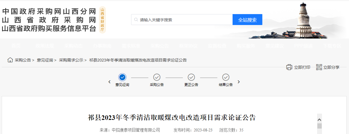 祁縣能源局的祁縣2023年冬季清潔取暖煤改電改造項目,根據財庫(2021)22號關于印發《政府采購需求管理辦法》的通知,我單位于2023年8月22日組織專家對該項目采購需求進行了論證,并根據專家意見修改完善采購內容,現將有關情況公告如下: