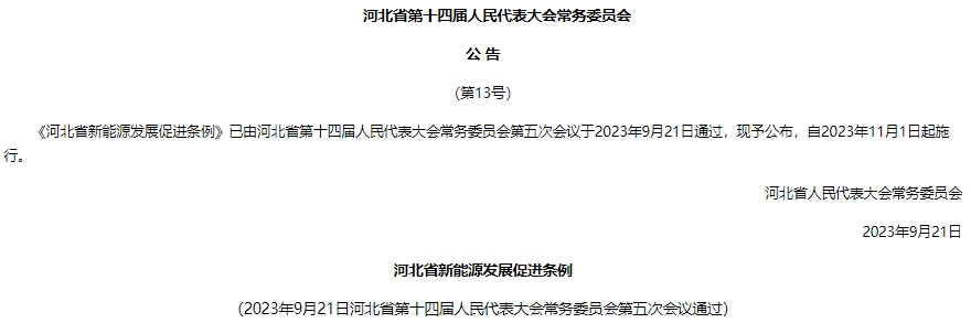 2023年8月14日,河北省人大常委會(huì)法制工作委員會(huì)發(fā)布關(guān)于《河北省新能源發(fā)展促進(jìn)條例(草案)》公開(kāi)征求意見(jiàn)的通知,2023年9月21日,河北省人民代表大會(huì)常務(wù)委員會(huì)第五次會(huì)議發(fā)布公告(第13號(hào))指出,《河北省新能源發(fā)展促進(jìn)條例》已由河北省第十四屆人民代表大會(huì)常務(wù)委員會(huì)第五次會(huì)議于2023年9月21日通過(guò),現(xiàn)予公布,自2023年11月1日起施行。