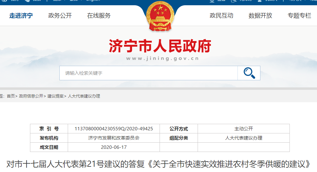 濟(jì)寧召開市十七屆人大代表會議上,人大代表劉金城提交《關(guān)于全市快速實(shí)效推進(jìn)農(nóng)村冬季供暖的建議》,濟(jì)寧市發(fā)改委于近期進(jìn)行答復(fù)。