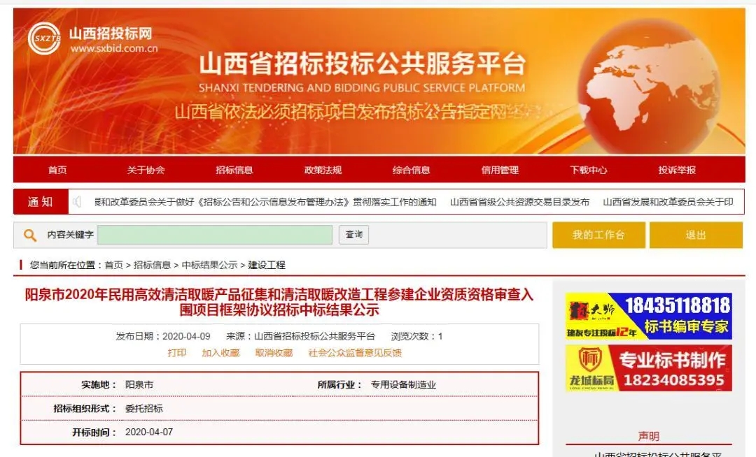 4月9日,山西陽泉市2020年民用高效清潔取暖產(chǎn)品征集和清潔取暖改造工程參建企業(yè)資質(zhì)資格審查入圍項(xiàng)目中標(biāo)結(jié)果公示。