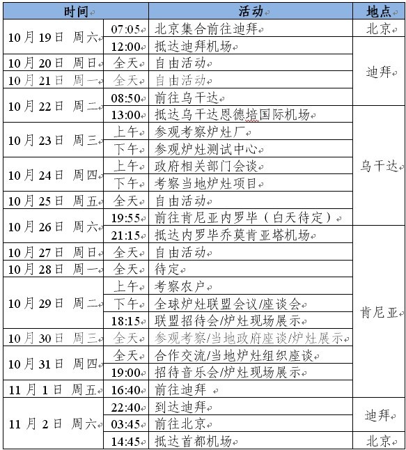 中國清潔爐灶聯盟負責組織安排考察期間的國際交通、境外當地交通、食宿、參會、翻譯、簽證及自由活動等事宜。請參加企業盡可能自行攜帶輕便的爐具產品進行宣傳展示。