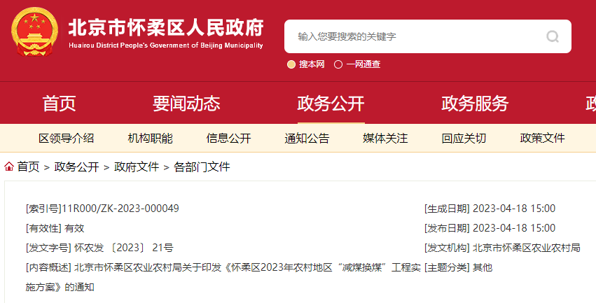 北京市懷柔區(qū)農(nóng)業(yè)農(nóng)村局關于印發(fā)《懷柔區(qū)2023年農(nóng)村地區(qū)“減煤換煤”工程實施方案》的通知