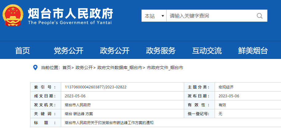 煙臺市人民政府關于印發煙臺市碳達峰工作方案的通知