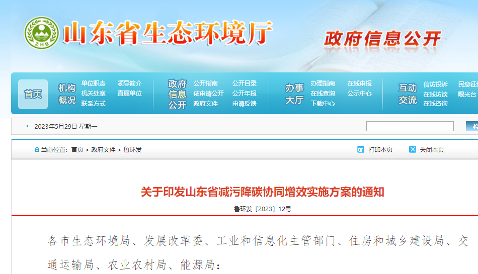 關(guān)于印發(fā)山東省減污降碳協(xié)同增效實施方案的通知