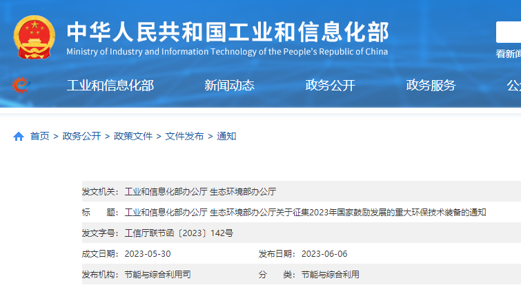 工業(yè)和信息化部辦公廳 生態(tài)環(huán)境部辦公廳關(guān)于征集2023年國家鼓勵發(fā)展的重大環(huán)保技術(shù)裝備的通知
