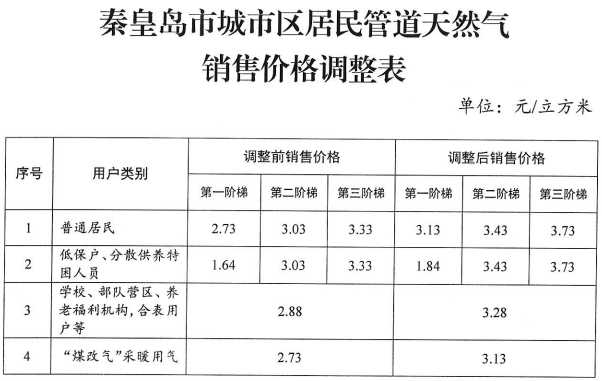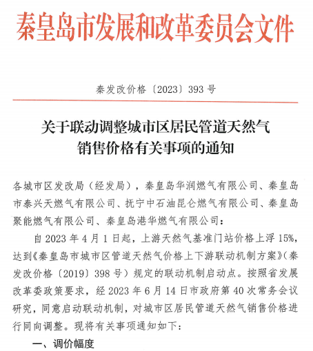 ◆秦皇島市發展和改革委員會關于聯動調整城市區居民管道天然氣銷售價格有關事項的通知