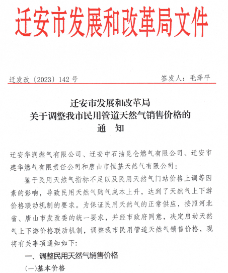 ◆遷安市發展和改革局關于調整我市民用管道天然氣銷售價格的通知