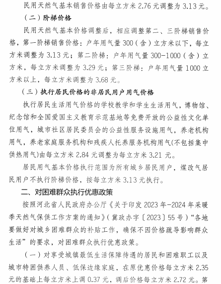按照河北省人民政府辦公廳《關于印發2023年-2024年采暖季天然氣保供工作方案的通知》(冀政辦字〔2023〕55號)“各地要做好對城鄉困難群體補貼工作,確保不因價格疏導影響群眾生活”的要求,對困難群眾執行優惠政策。