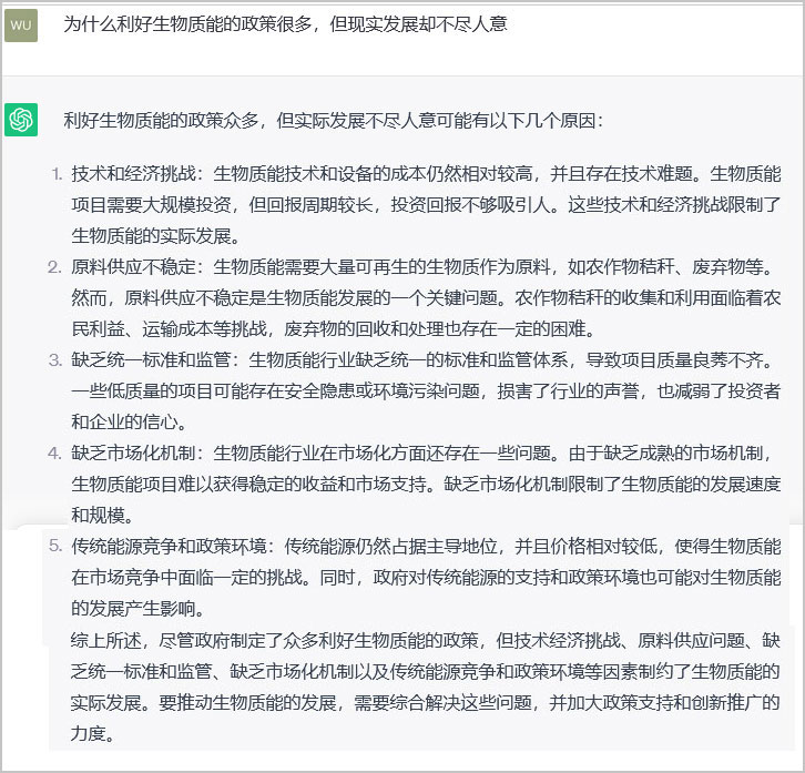 雖然我國從上到下出臺了一系列發展生物質能的政策,但關于生物質能發展中遇到的一些問題我們時常有所耳聞,實際推廣中生物質能供熱的發展并不順利。帶著這個疑惑,問了問最近比較火熱的chatGPT,看看它是如何看待這個問題的。