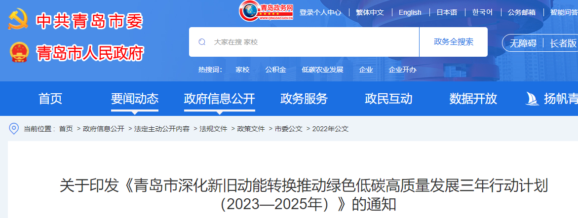 青島市深化新舊動能轉(zhuǎn)換推動綠色低碳高質(zhì)量發(fā)展三年行動計(jì)劃(2023—2025年)
