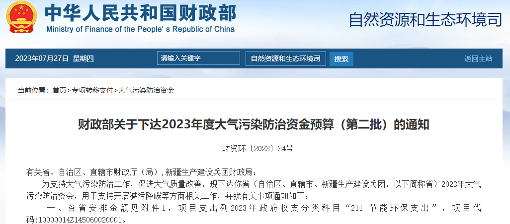 財政部關于下達2023年度大氣污染防治資金預算(第二批)的通知