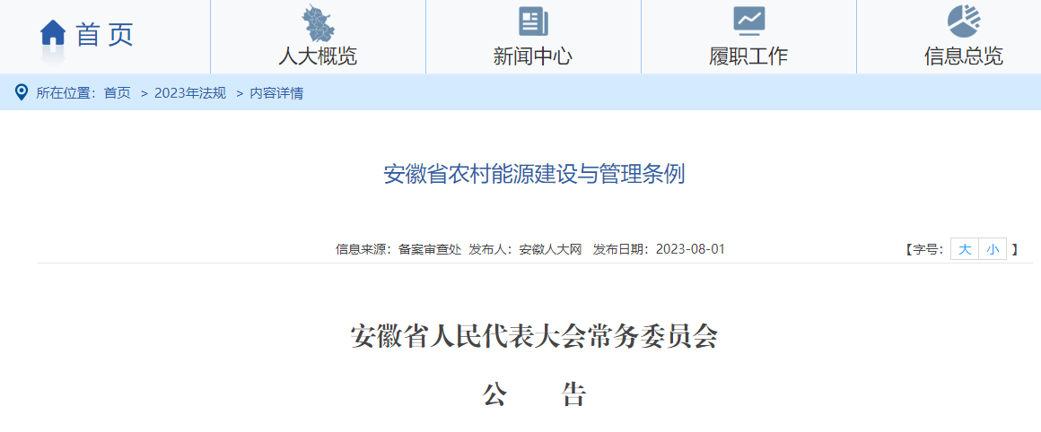 《安徽省農(nóng)村能源建設(shè)與管理條例》已經(jīng)2023年7月28日安徽省第十四屆人民代表大會常務(wù)委員會第三次會議修訂通過,現(xiàn)予公布,自2023年10月1日起施行。