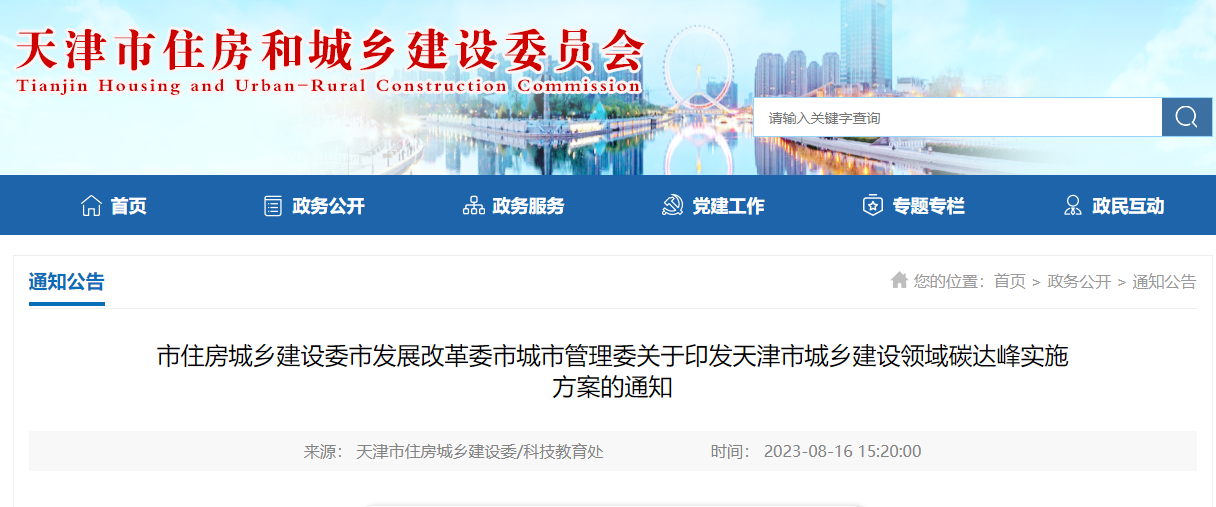 市住房城鄉建設委市發展改革委市城市管理委關于印發天津市城鄉建設領域碳達峰實施方案的通知