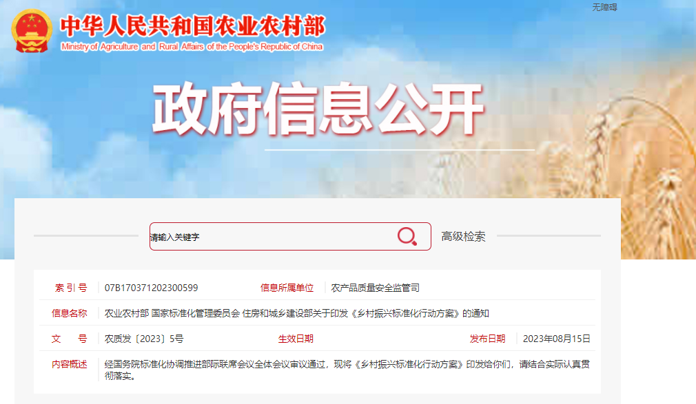 農(nóng)業(yè)農(nóng)村部、國(guó)家標(biāo)準(zhǔn)化管理委員會(huì)、住房和城鄉(xiāng)建設(shè)部關(guān)于印發(fā)《鄉(xiāng)村振興標(biāo)準(zhǔn)化行動(dòng)方案》的通知