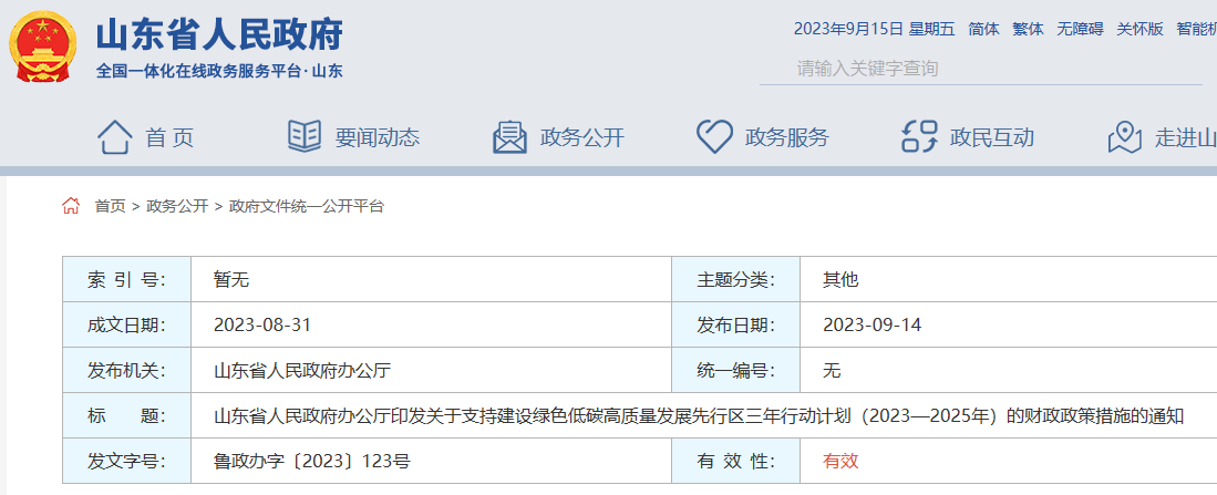 山東省人民政府辦公廳印發(fā)關(guān)于支持建設(shè)綠色低碳高質(zhì)量發(fā)展先行區(qū)三年行動(dòng)計(jì)劃(2023—2025年)的財(cái)政政策措施的通知