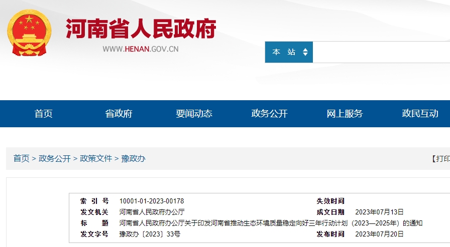 河南省人民政府辦公廳關于印發河南省推動生態環境質量穩定向好三年行動計劃(2023—2025年)的通知