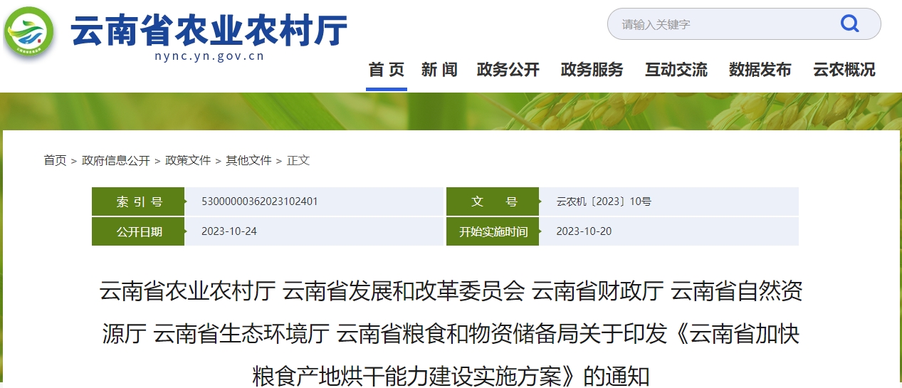 云南省農業農村廳、云南省發展和改革委員會、云南省財政廳、云南省自然資源廳、云南省生態環境廳、云南省糧食和物資儲備局關于印發《云南省加快糧食產地烘干能力建設實施方案》的通知
