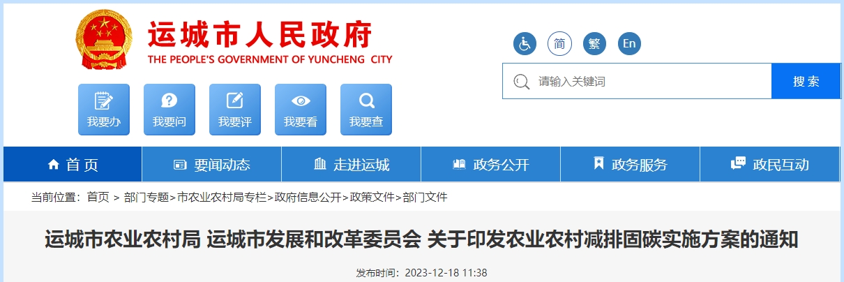 運城市農業農村局 運城市發展和改革委員會 關于印發農業農村減排固碳實施方案的通知