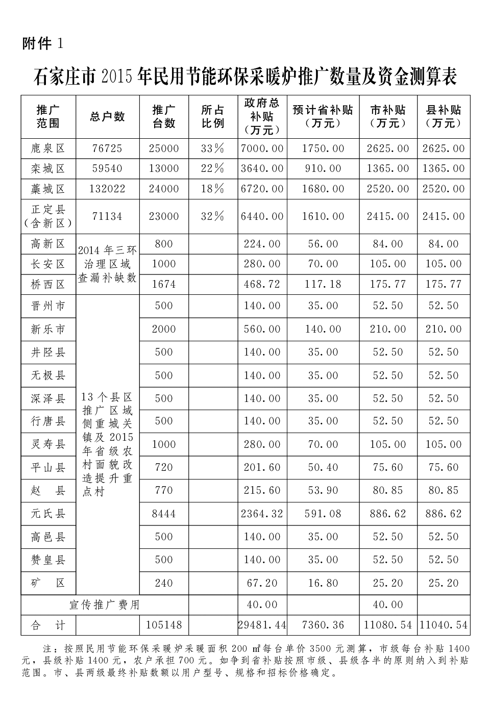 1.石家莊市2015年民用節(jié)能環(huán)保采暖爐推廣數(shù)量及資金測(cè)算表