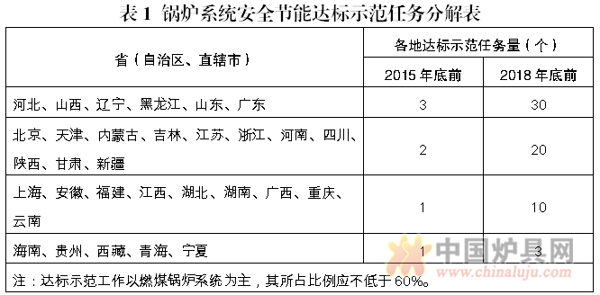 2.組織實施。各地根據(jù)任務(wù)分解(見表1)要求,制定本地區(qū)安全節(jié)能達標(biāo)鍋爐系統(tǒng)示范推進計劃,鼓勵本地區(qū)管理規(guī)范、能效水平較高的鍋爐使用單位參加鍋爐系統(tǒng)安全節(jié)能達標(biāo)示范活動。各地要組織專家指導(dǎo)鍋爐使用單位提升安全節(jié)能管理水平,按照《鍋爐系統(tǒng)安全節(jié)能標(biāo)準(zhǔn)化管理評價表》(見附件)要求對參加活動的鍋爐系統(tǒng)進行達標(biāo)評價。總局將完善鍋爐系統(tǒng)安全節(jié)能標(biāo)準(zhǔn)化管理評價方法,提出相關(guān)技術(shù)規(guī)范和標(biāo)準(zhǔn)。