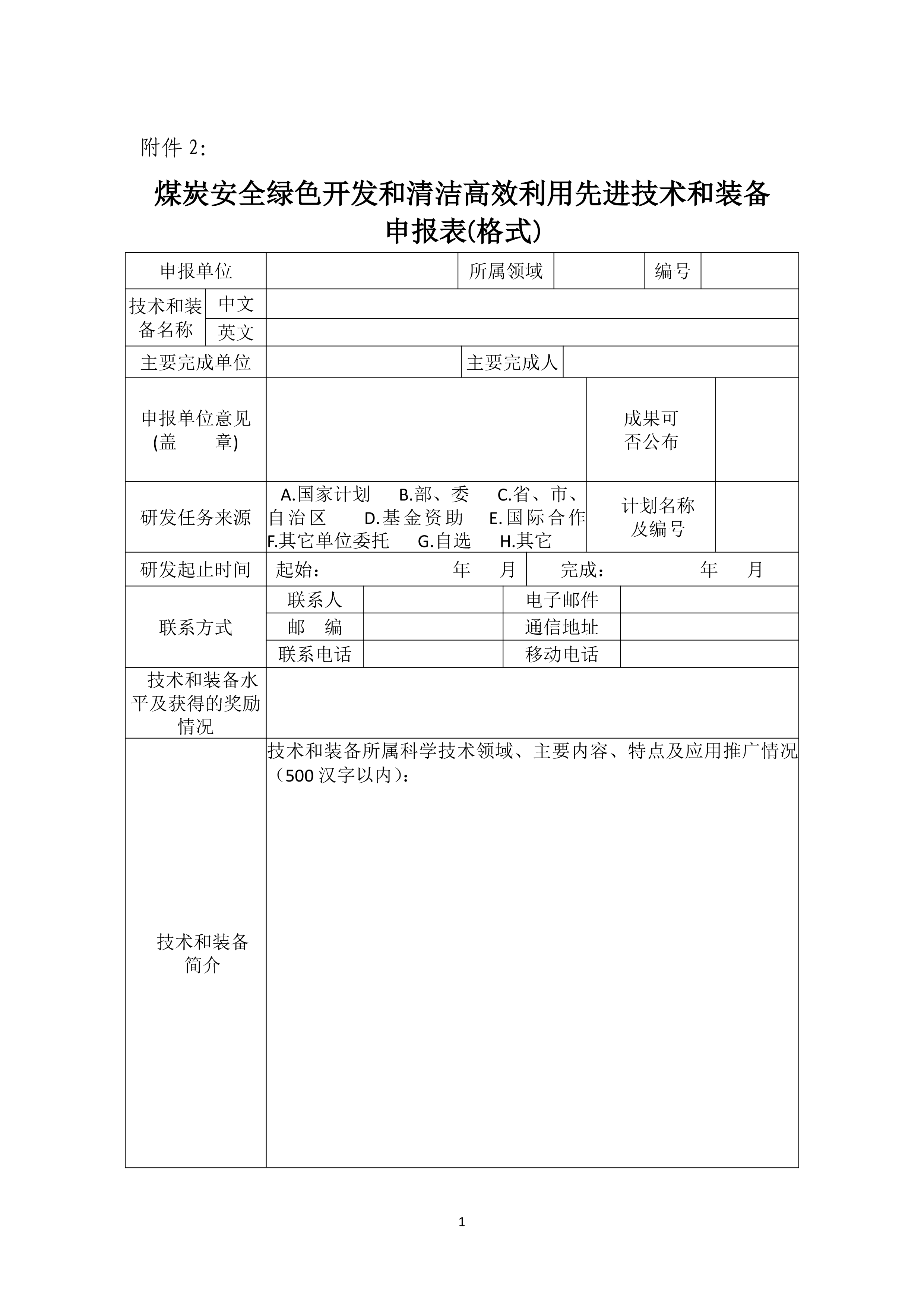 2、煤炭安全綠色開(kāi)發(fā)和清潔高效利用先進(jìn)技術(shù)和裝備申報(bào)表(申報(bào)單位填寫(xiě))