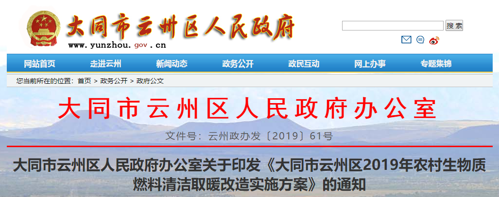 《大同市云州區2019年農村生物質燃料清潔取暖改造實施方案》已經區人民政府同意,現印發給你們,請認真遵照執行,并抓好貫徹落實。