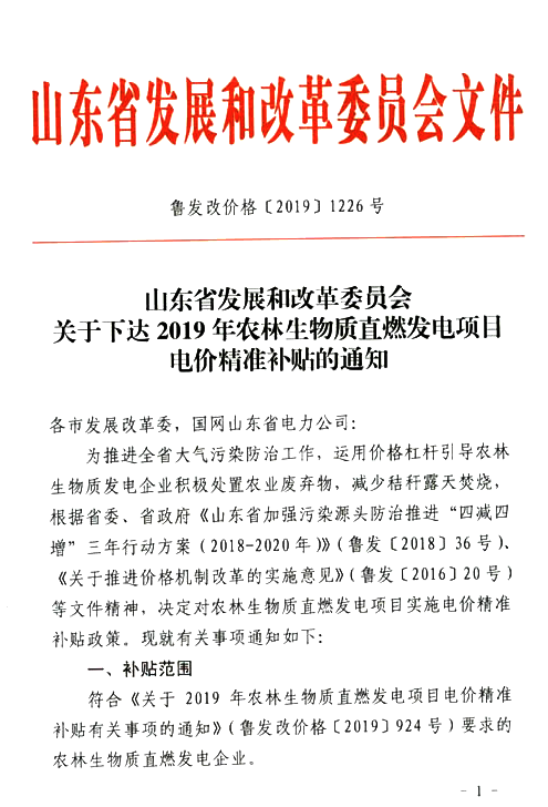 2019年12月31日,山東省發改委下發《關于下達2019年農林生物質直燃發電項目電價精準補貼的通知》,其中表示每家企業基本電費補貼標準為360萬元(含稅),省內30家生物質發電企業分別獲得了450萬元-1100萬元的發電和農業廢棄物使用補貼。附原文: