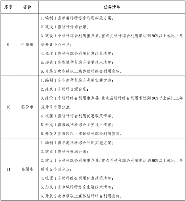 遴選絳縣、襄汾縣、鄉寧縣、和順縣、陽高縣、壺關縣、神池縣、代縣、孝義市等9個縣(市、區),作為國家秸稈綜合利用重點縣,整縣推進秸稈綜合利用試點,打造全省秸稈綜合利用的“樣板縣”。各重點縣要因地制宜確定秸稈利用方式,優化秸稈綜合利用結構,切實做到技術措施有用、工作措施有效、管理措施有力、持續運行有保障,推動縣域秸稈綜合利用率達到90%以上或比上年提高5個百分點。各重點縣要認真總結凝練政策措施、工作措施、技術措施等方面的經驗做法,形成1套配套政策強、工作力度大、技術支撐好、服務組織多的縣域秸稈綜合利用典型模式。各重點縣12月10前報送重點縣工作總結和縣域典型模式材料。