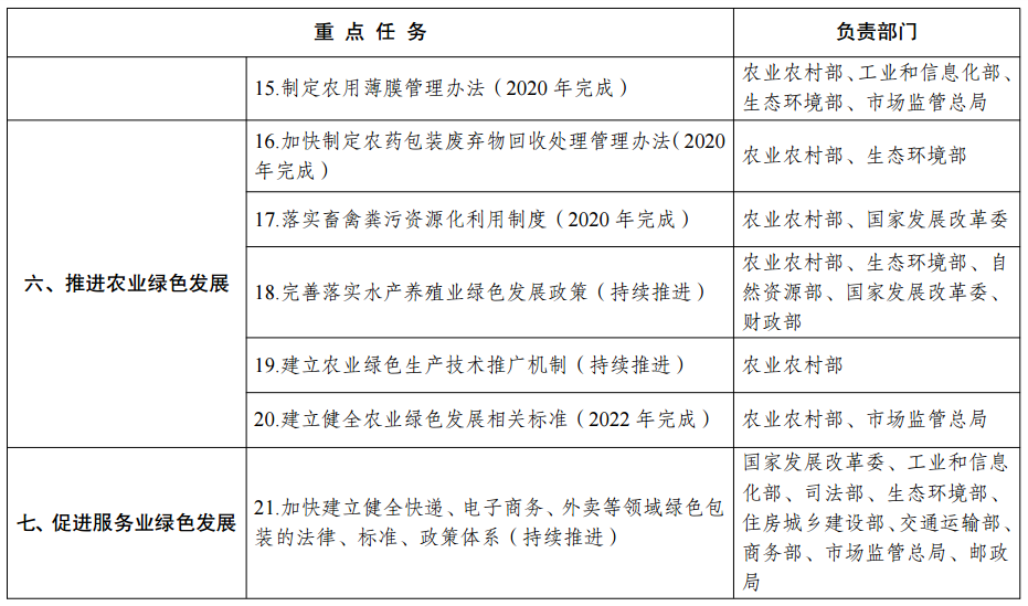 (八)推進農業綠色發展。以綠色生態為導向,創新農業綠色發展體制機制,開展農業綠色發展支撐體系建設,創新技術體系、健全標準體系、延伸產業體系、強化經營體系、完善政策體系,為農業綠色發展提供保障。大力推進科學施肥,建立有機肥替代化肥推廣政策機制。實施化學農藥減量替代計劃,建立生物防治替代化學防治推廣政策機制,支持研發推廣農作物病蟲害綠色防控技術產品。制定農用薄膜管理辦法,建立全程監管體系,支持推廣使用生物可降解農膜。加快制定農藥包裝廢棄物回收處理管理辦法。完善農作物秸稈綜合利用制度,以縣為單位整體推進秸稈全量化綜合利用。以肥料化和能源化為主要利用方向,落實畜禽糞污資源化利用制度。完善落實水產養殖業綠色發展政策,依法加強養殖水域灘涂統一規劃。建立飼料添加劑和獸藥使用規范,健全病死畜禽無害化處理機制。穩步推進耕地輪作休耕制度試點。健全農業循環經濟推廣制度,建立農業綠色生產技術推廣機制。落實農業綠色發展稅收支持政策。建立健全農業綠色發展相關標準,加快清理、廢止與農業綠色發展不適應的標準和行業規范。(農業農村部、國家發展改革委、工業和信息化部、財政部、自然資源部、生態環境部、水利部、稅務總局、市場監管總局等按職責分工負責)
