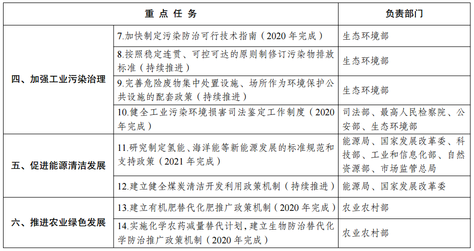 (六)加強工業污染治理。全面推行污染物排放許可制度,強化工業企業污染防治法定責任。加快制定污染防治可行技術指南,按照穩定連貫、可控可達的原則制修訂污染物排放標準,嚴格環境保護執法監督,實現工業污染源全面達標排放,鼓勵達標企業實施深度治理。完善危險廢物集中處置設施、場所作為環境保護公共設施的配套政策。建立健全責任清晰、程序合理、科學規范的生態環境突發事件預警和應急機制,建立生態環境突發事件后評估機制。健全工業污染環境損害司法鑒定工作制度,建立完善行政管理機關、行政執法機關與監察機關、司法機關的銜接配合機制,促進工業污染治理領域處罰信息和監測信息共享,充分發揮檢察機關公益職能作用,形成工業污染治理多元化格局。(最高人民法院、最高人民檢察院、公安部、司法部、生態環境部、工業和信息化部、國家發展改革委、財政部等按職責分工負責)