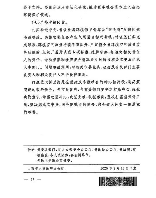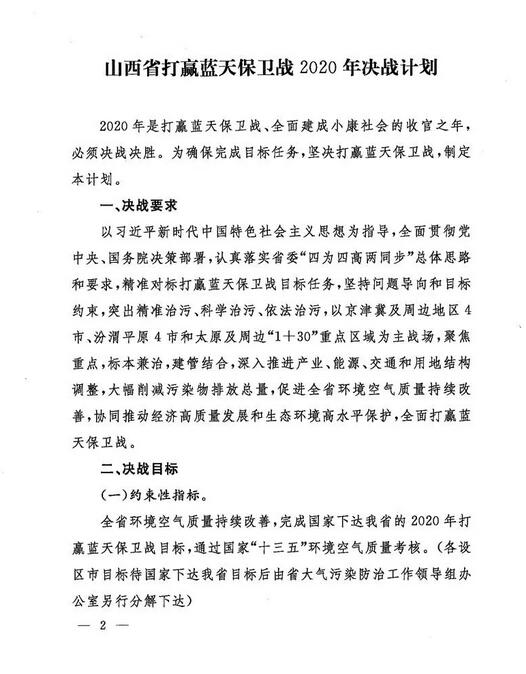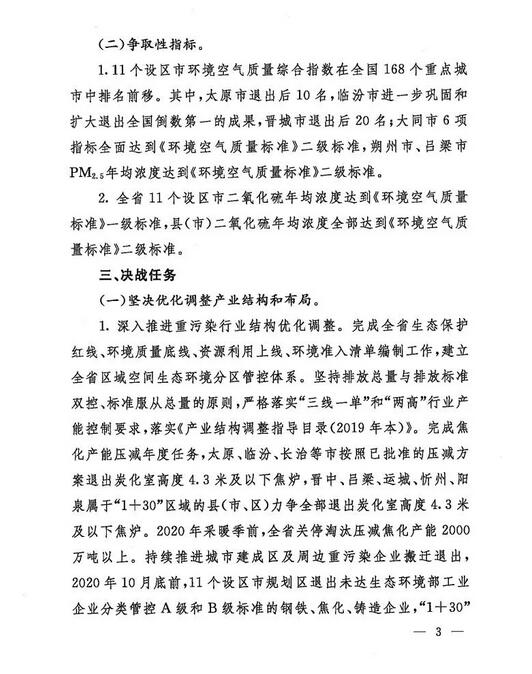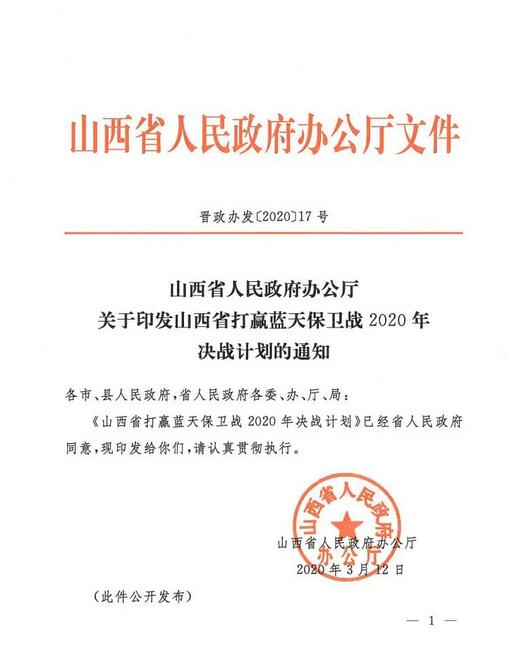 近日,山西省人民政府辦公廳下發《山西省打贏藍天保衛戰2020年決戰計劃》,明確今年打贏藍天保衛戰的決戰要求、決戰目標、決戰任務、決戰保障等,要求堅決向結構開刀,深入推進產業、能源、交通和用地四大結構調整,大幅削減污染物排放總量,促進全省環境空氣質量持續改善,協同推動經濟高質量發展和生態環境高水平保護,全面打贏藍天保衛戰。