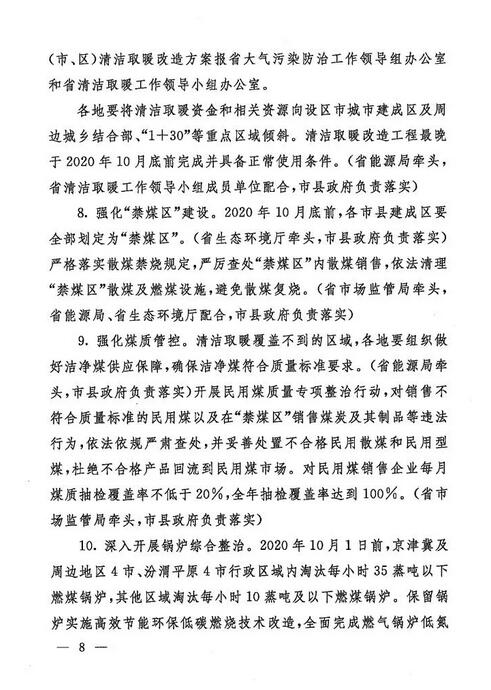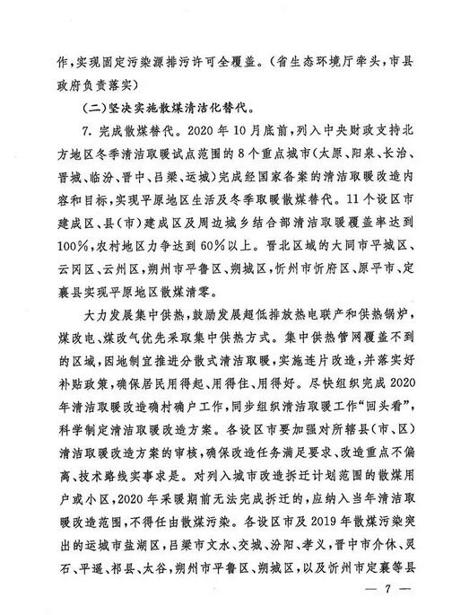 在“堅決實施散煤清潔化替代”方面——要求2020年10月底前,列入中央財政支持北方地區冬季清潔取暖試點范圍的8個重點城市(太原、陽泉、長治、晉城、臨汾、晉中、呂梁、運城)完成經國家備案的清潔取暖改造內容和目標,實現平原地區生活及冬季取暖散煤替代。11個設區市建成區、縣(市)建成區及周邊城鄉結合部清潔取暖覆蓋率達到100%,農村地區力爭達到60%以上。晉北區域的大同市平城區、云崗區、云州區,朔州市平魯區、朔城區,忻州市忻府區、原平市、定襄縣實現平原地區散煤清零。