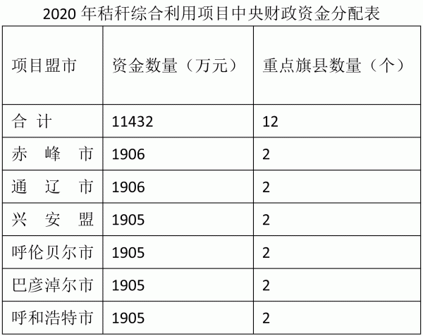 2020年秸稈綜合利用項目中央財政資金合計11432萬元,作為約束性任務在6個盟市12個旗縣實施(詳見下表)。