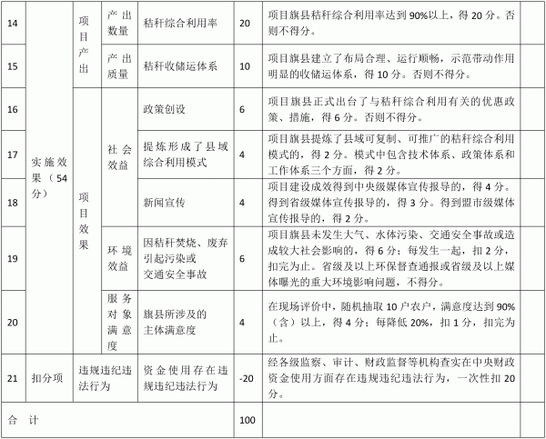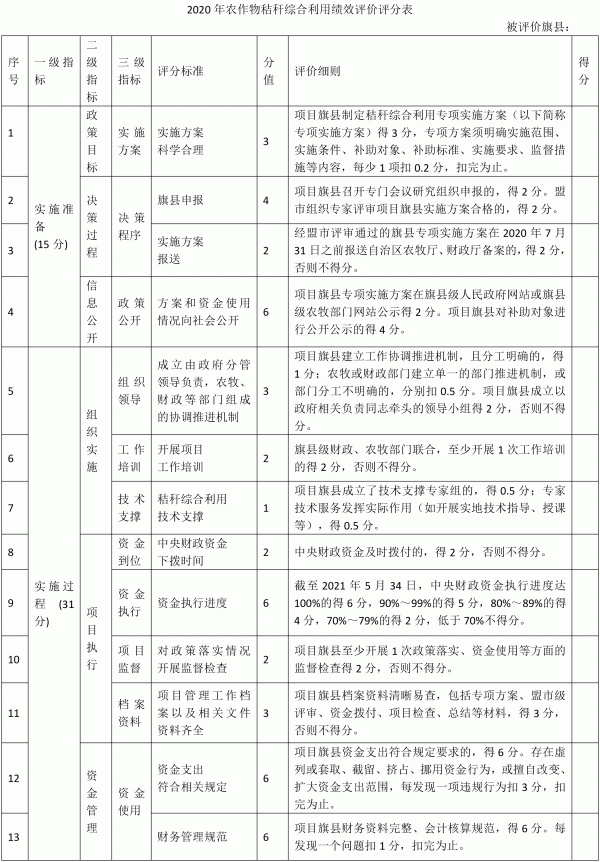 (五)嚴格督導考核。在國家秸稈綜合利用績效考核目標的基礎上,自治區農牧廳進一步完善了秸稈綜合利用績效考核指標體系(見附表),將采取多種方式對項目實施進行年度績效考核。各地要細化績效考評內容,制定考核辦法,爭取將考核內容列入政府目標責任考核范圍,建立項目實施監管責任制和責任追究制,加強督促檢查,建立動態跟蹤檢查機制,形成齊抓共管、上下聯動的工作格局。