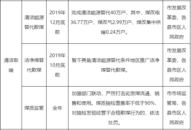 8.有效推進(jìn)清潔取暖。按照“以氣定改、以供定需,先立后破、不立不破”的原則,堅持“先規(guī)劃、先合同、后改造”,在保證溫暖過冬的前提下,集中資源大力推進(jìn)散煤治理。同步推動建筑節(jié)能改造,提高能源利用效率,保障工程質(zhì)量,嚴(yán)格安全監(jiān)管。因地制宜,合理確定改造技術(shù)路線。堅持宜電則電、宜氣則氣、宜煤則煤、宜熱則熱,積極推廣太陽能光熱利用和集中式生物質(zhì)利用。根據(jù)簽訂的采暖期供氣合同氣量以及實際供氣供電能力等,合理確定“煤改氣”“煤改電”戶數(shù),合同簽訂不到位、基礎(chǔ)設(shè)施建設(shè)不到位、安全保障不到位的情況下,不新增“煤改氣”戶數(shù)。充分利用電廠供熱潛能,加快供熱管網(wǎng)建設(shè),加大散煤替代力度。“煤改電”以可持續(xù)、取暖效果佳、可靠性高、受群眾歡迎的技術(shù)為主,積極推廣集中式電取暖、蓄熱式電暖器、空氣源熱泵等,不鼓勵取暖效果差、群眾意見大的電熱毯、“小太陽”等簡易取暖方式。嚴(yán)格按照中、省要求時限,完成全市40萬戶散煤治理年度任務(wù)。(市發(fā)展改革委牽頭,市住房城鄉(xiāng)建設(shè)局、市財政局、市生態(tài)環(huán)境局參與)