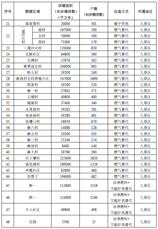 1.“煤改氣”項目。對不具備接入熱電聯產集中供熱,可接入天然氣管網的村莊(片區),通過“煤改氣”進行改造。涉及35個村、534萬平方米、29989戶。其中:昆區1個村、5930戶、50萬平方米,青山區涉1個村、1200戶、22萬平方米,東河區4個村、2580戶、40萬平方米,九原區23個村、15110戶、232萬平方米,稀土高新區6個村、5169戶、190萬平方米。