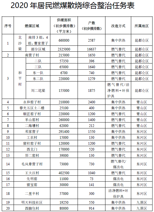 按照《內蒙古自治區打贏藍天保衛戰三年行動計劃實施方案》《包頭市貫徹落實自治區環保督察反饋意見整改方案》和《包頭市2020年污染防治攻堅戰行動計劃》有關要求,2020年對高污染燃料禁燃區內64個村莊(片區)燃煤散燒用戶進行綜合整治,從根本上改善我市冬季采暖煤煙型污染嚴重的現狀。