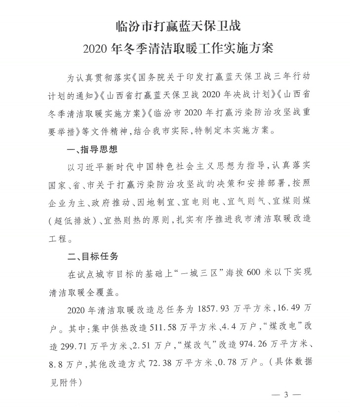 為認真貫徹落實《國務院關于印發打底藍天保衛戰三年行動計劃的通知》《山西省打森藍天保衛戰2020年決戰計劃》《山西省冬季清潔取暖實施方案 》《臨汾市2020年打贏污染防治攻堅戰重要舉措》 等文件精神,結合我市實際,特制定本實施方案。