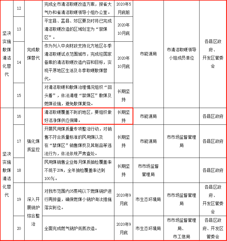 6.完成散煤替代。2020年10月底前,我市作為列入中央財政支持北方地區冬季清潔取暖試點范圍城市,完成經國家備案的清潔取暖改造內容和目標,實現平原地區生活及冬季取暖散煤替代。