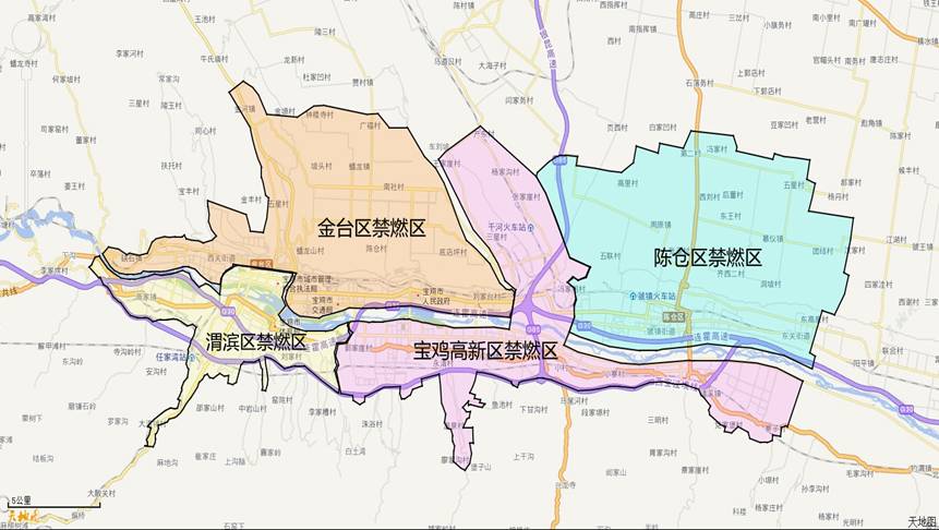 (四)寶雞高新區(qū)禁燃區(qū)范圍:東至伐魚河;西至茵香河;南至寶鈦集團(tuán)老廠;北至千河鎮(zhèn)王家崖水庫壩面。總面積96.85平方公里。