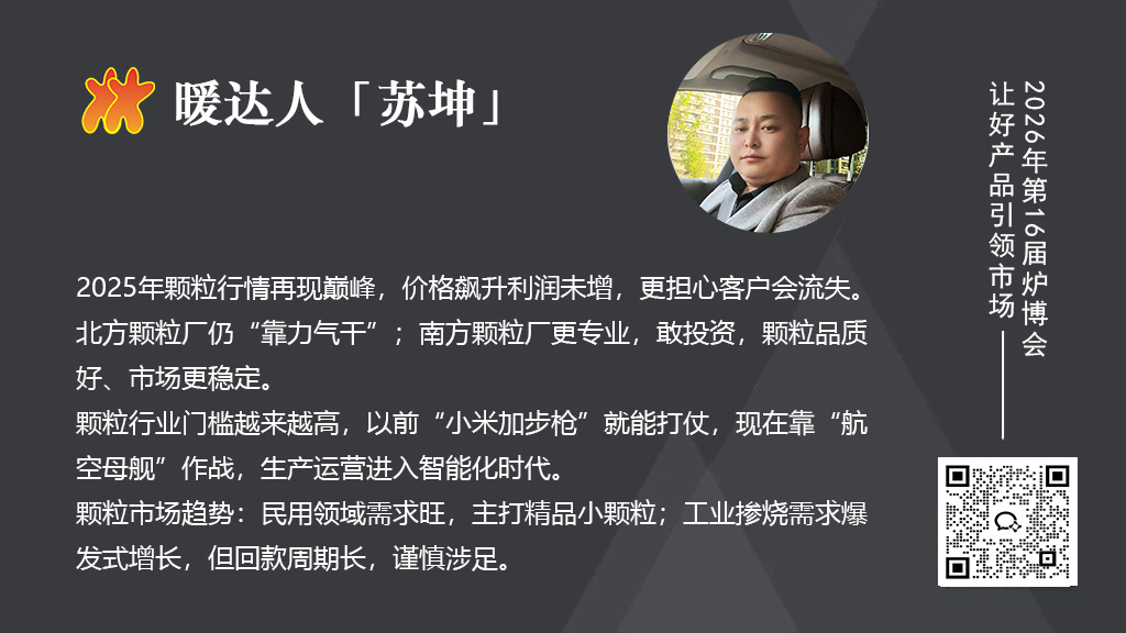 希望在明年的第16屆爐博會上,能多展示一些顆粒生產的先進技術,比如管理系統、分選除雜設備等,能讓更多的顆粒廠看到技術設備能提升原料和品質。也希望南北方的企業能多交流,北方企業應學習一下南方企業的思路,別再靠“拼力氣”競爭了。最重要的是,讓下游客戶能看到優質顆粒的價值,別只盯著價格。好顆粒雖然貴一點,但能幫他們省更多的成本,這才是雙贏。