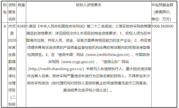 齊河縣2020年度全縣散煤清潔凈化治理項(xiàng)目(二標(biāo)段)公開(kāi)招標(biāo)公告