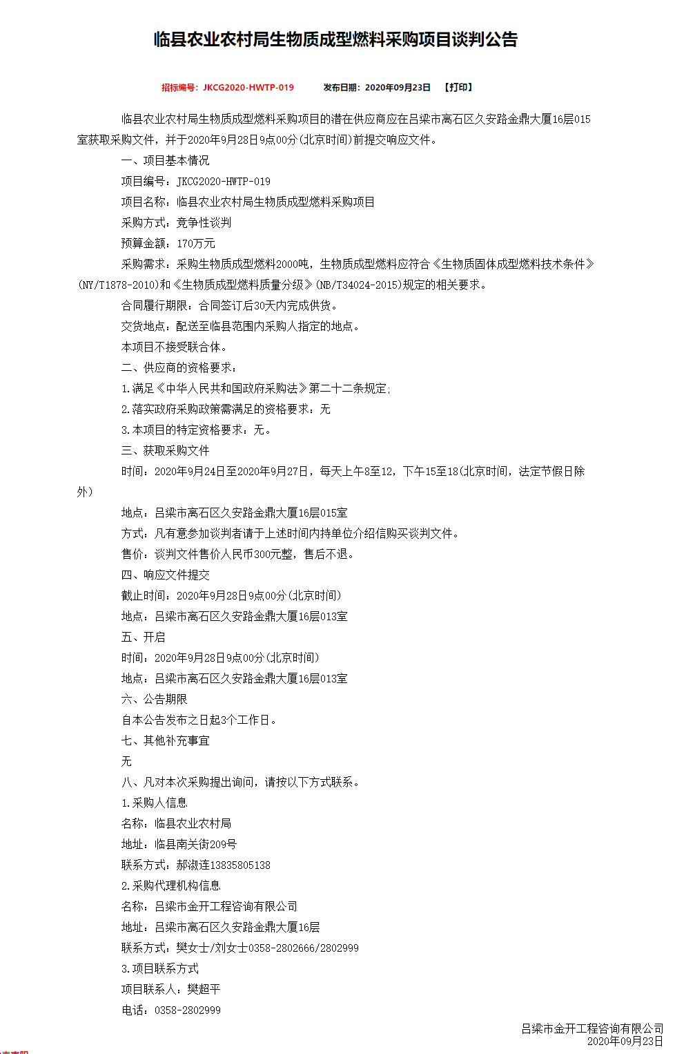 項目名稱:臨縣農業農村局生物質成型燃料采購項目