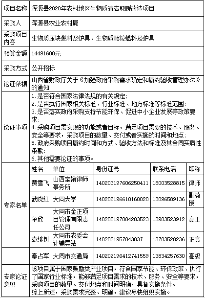 渾源縣農業農村局因工作需求,擬對渾源縣2020年農村地區生物質清潔取暖改造項目進行公開招標采購,根據山西省財政廳《加強政府采購需要確定和履約驗收管理辦法》文件要求,山西合瑞通晨招標代理有限公司受渾源縣農業農村局委托于2020年10月22日組織專家對該項目組織的需求論證,并根據專家意見修改完善了相關內容,現將有關情況公示如下: