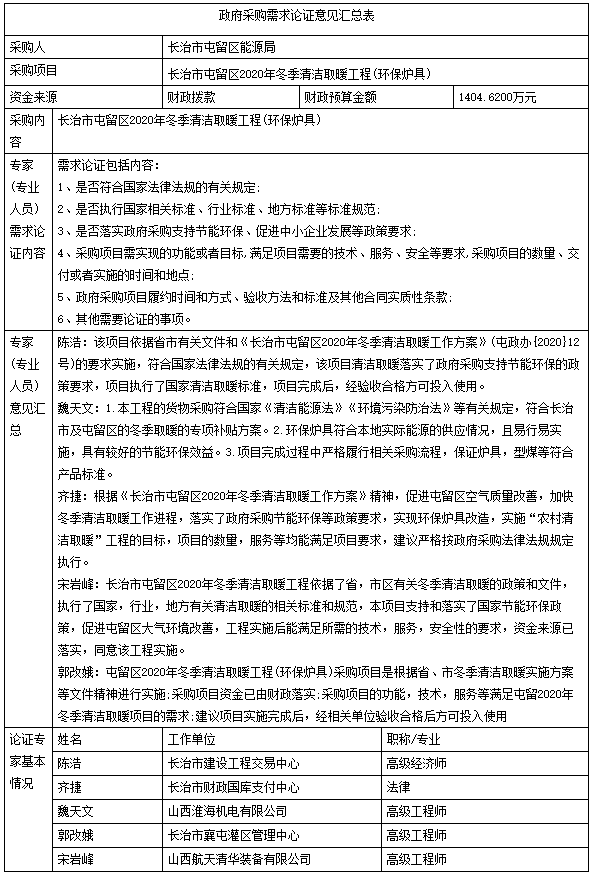 山西中盛卓遠(yuǎn)工程項(xiàng)目管理有限公司受長治市屯留區(qū)能源局委托就長治市屯留區(qū)2020年冬季清潔取暖工程(環(huán)保爐具)進(jìn)行需求論證,于2020年11月17日組織專家對該項(xiàng)目需求進(jìn)行了論證,現(xiàn)將現(xiàn)有關(guān)情況公示如下: